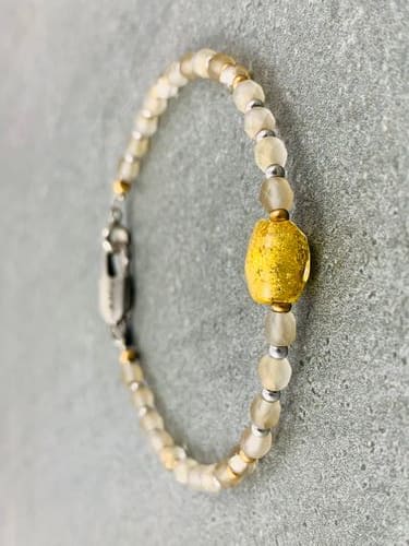Perla in vetro trasparente effetto lucido con foglia oro 24 kt/foglia argento puro, perle in vetro satinato. Componenti: lega di metallo galvanizzato. Conteria veneziana.