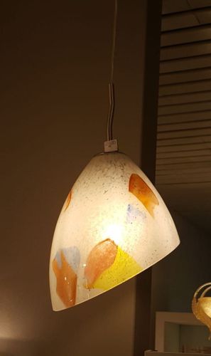 mod. Perla/S sospensione vetro bianco con murrine, montatura nickel satinato cm. D.21 H. 25+150 cavo - 1 luce W27 70W